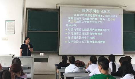根据我校旅游管理和酒店管理16级教学计划要求,旅游管理161班、酒店管理161班、酒店管理162班全体学生将于2018年7月初进入为期半年的顶岗实习实践教学环节。为了安排好本次顶岗实习,旅游教研室全体教师多方面多途径联系实习单位,于2018年6月19日前为全体学生联系好实习单位,6月19日下午在C104教室召开顶岗实习动员大会。