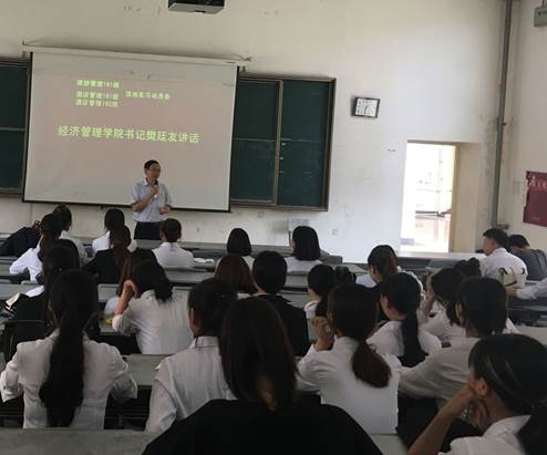 管理学院樊廷友书记对顶岗实习的要求、安全等事项作了重要指示。樊书记要求同学们一定要注意安全,多和父母老师联系,严格遵守企业的规章制度,通过顶岗实习学到更多知识、积累更多经验,祝愿同学们在实习期间平安、顺利。