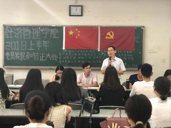 6月6日,管理学院学生第一党支部在南苑教学楼A203召开了2018年上半年党员发展暨转正大会。本次大会旨在吸纳优秀学生壮大党员队伍,为支部将来的发展打下坚实的基础。出席本次会议的有党总支书记樊廷友,党总支副书记史在宏,支部书记胡春以及入党介绍人:黎梦、邓凯艳、孙文覃,支部全体学生党员参加了大会。